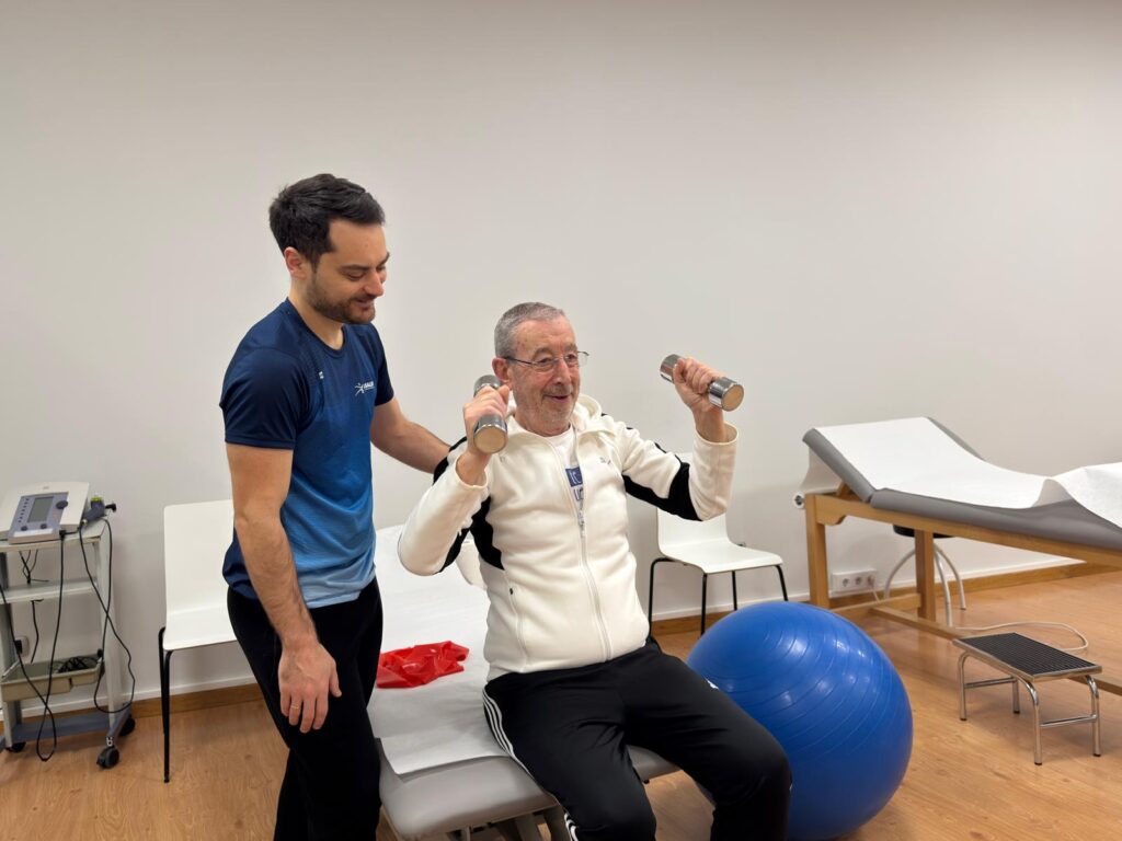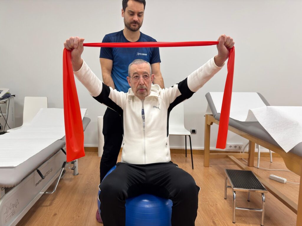 El trabajo de fuerza puede realizarse mediante ejercicios con bandas elásticas, mancuernas o lastres ligeros, así como con el propio peso corporal, utilizando apoyos cuando sea necesario. Asimismo, el fortalecimiento de la musculatura del tronco es especialmente importante, ya que contribuye a un mejor control postural y a una mayor estabilidad durante los movimientos cotidianos.